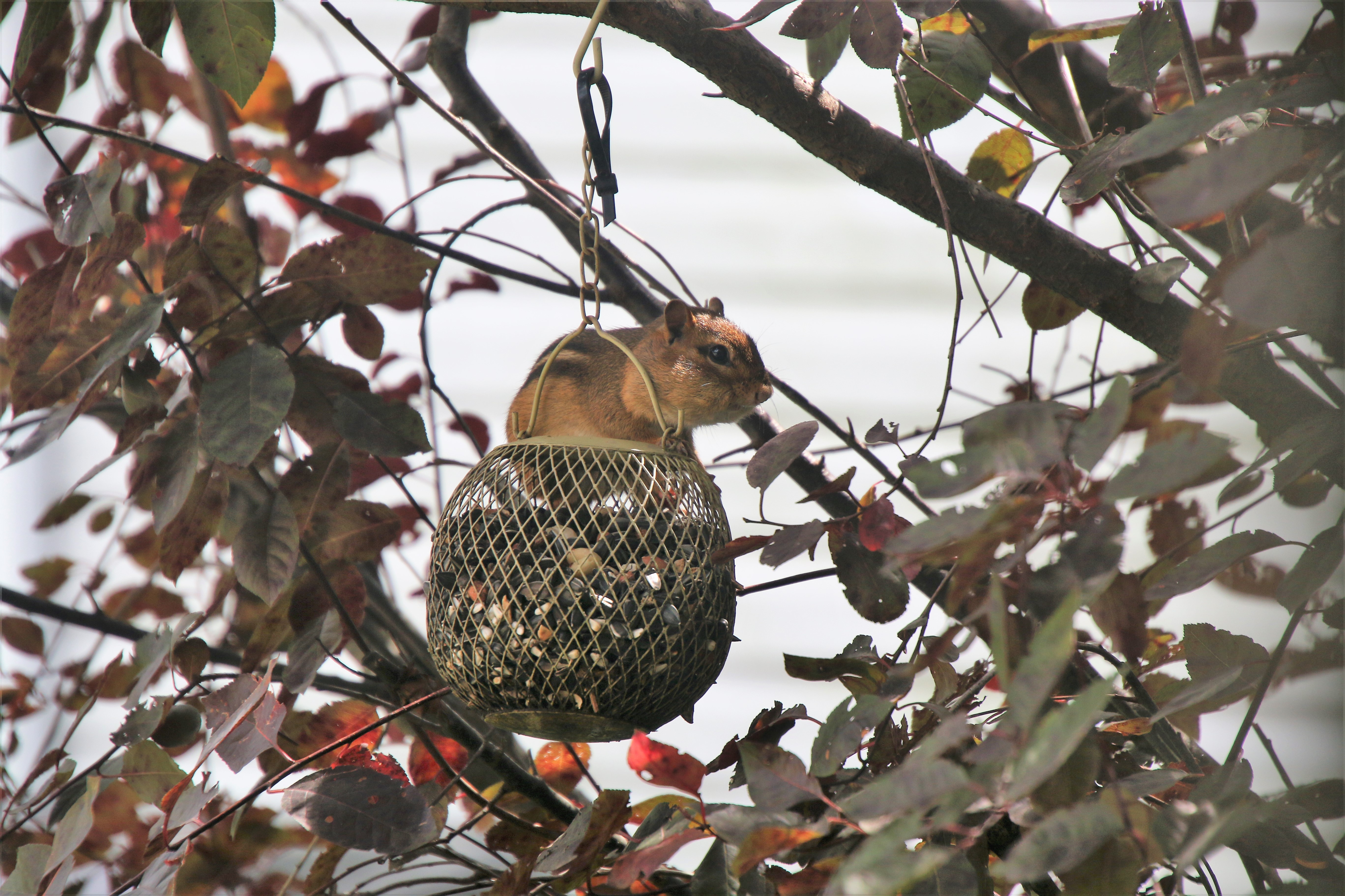The little fellow filled his cheeks to the max and scurried to the back of the house to hide his treasure. He made several trips in the same fashion and managed to empty the feeder of most of its contents in record timing.