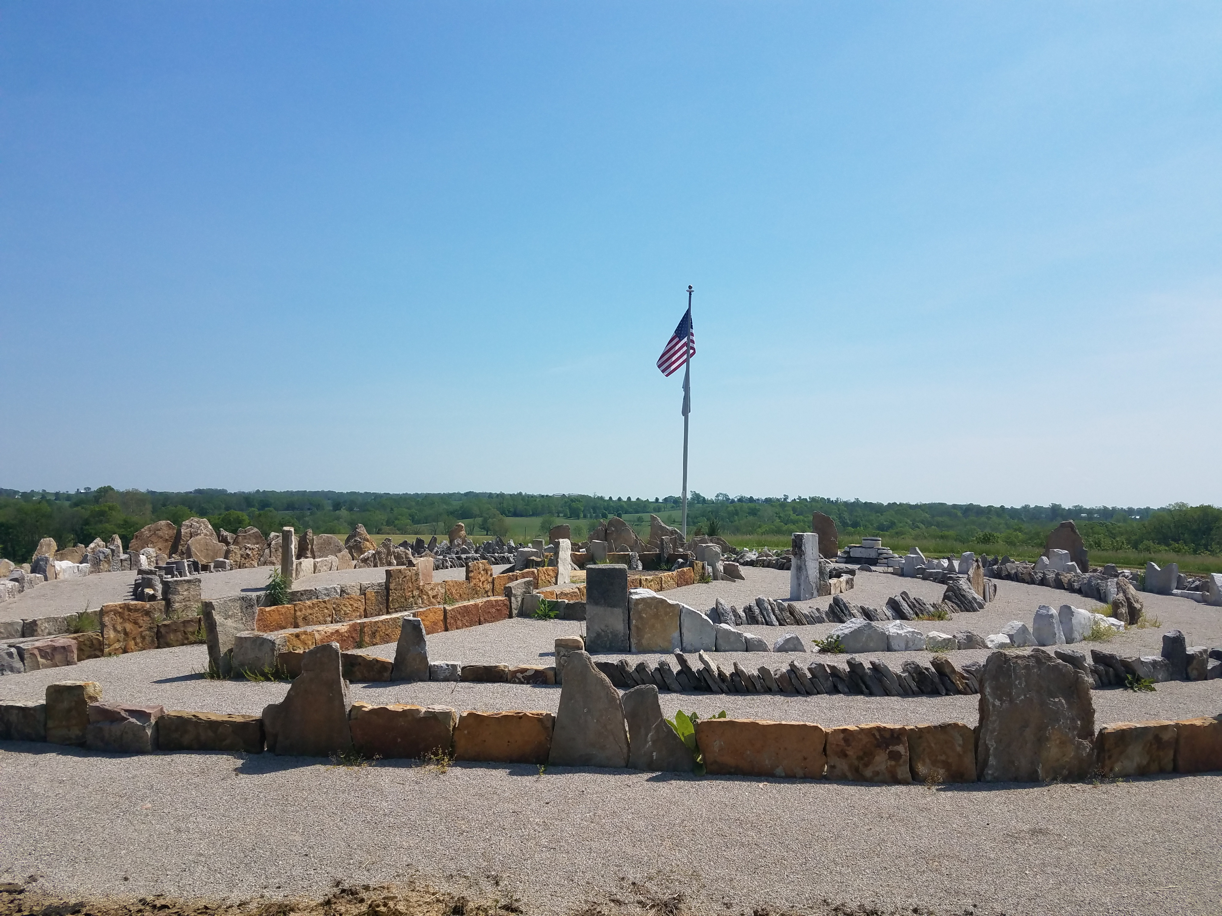 At the last stop of the day, I raised up from climbing out of the rear of the van, my eyes met head on with a beautiful labyrinth made of rocks. What a sight to behold. I knew at that very moment this was significant. A flag pole was positioned at the back side with two flags flying in the wind.