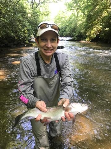 My helpful guide, Chris, supplied all the necessary equipment including the awesome waders and boots. All I had to do was show up. The weather was a bit threatening with storms the night before. But, the morning of my trip, the sun was breaking through the trees hitting the water with a brilliant glow, as I maneuvered the slippery rocks, with one hand on my guide’s arm, like an usher leading me to my seat at the theatre.