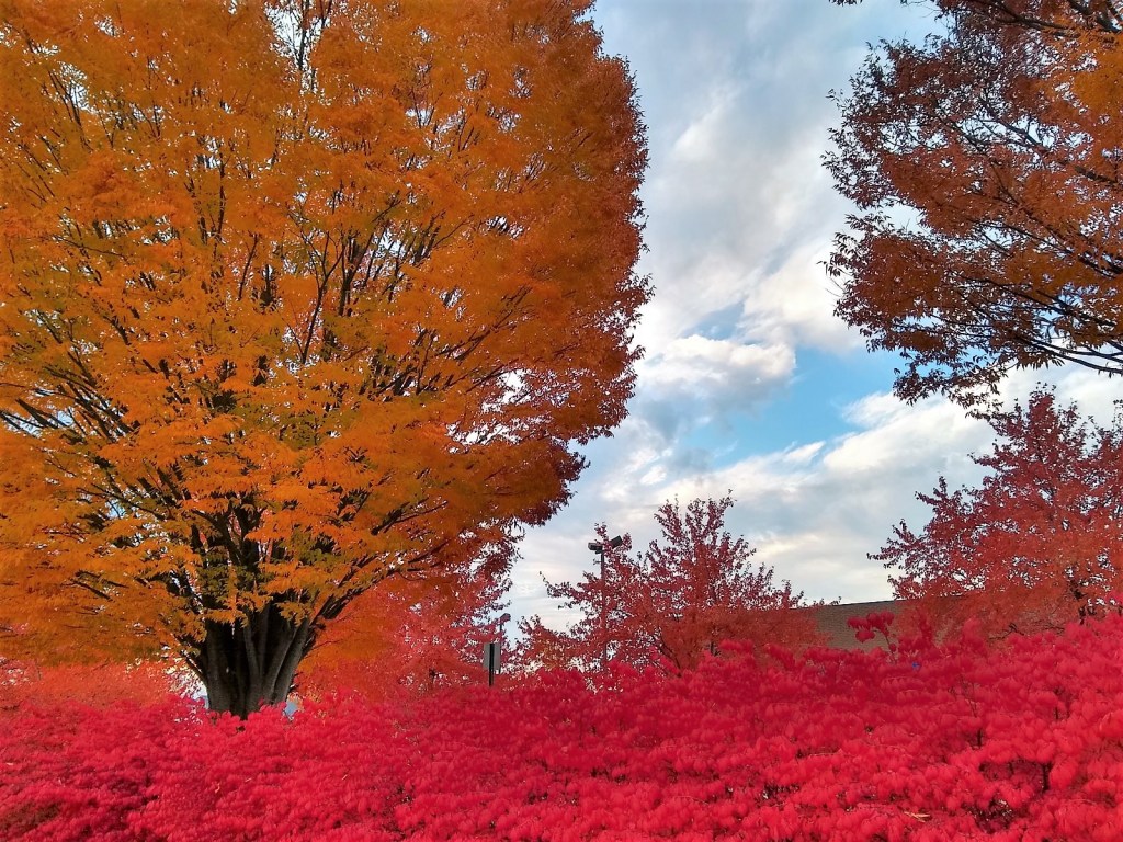 On an early morning run this week, I met an ominous sky lurking over the horizon and a wind that was brewing something that would surely send the leaves flurrying to the ground. I realized my last chance this season to capture the rich array of fall colors that lined my streets, was in that very moment. So, I ran back to the house and grabbed my phone so I could finish my run as well without lugging the larger camera around my neck. The bright yellows and oranges stood out even more prominent behind a brilliant fuchsia skirt that adorned their trunks.